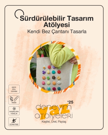 Sürdürülebilir Tasarım Atölyesi; Kendi Bez Çantanı TasarlaDeneyim Merkezi Açık Hava Atölyeleri kapsamında "Sürdürülebilir Tasarım Atölyesi; Kendi Bez Çantanı Tasarla" yapıyoruz. Bu yaz, şehirde sıradanlıktan uzaklaşmak ve açık havada birlikte üretmek isteyen üniversite öğrencileri için dopdolu bir program sizlerle!