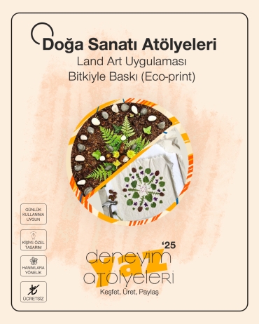 Doğa Sanatı Atölyeleri: Land Art Uygulaması ve Bitkiyle Baskı (Eco-Print)Deneyim Merkezi Açık Hava Atölyeleri kapsamında "Land Art Uygulaması ve Bitkiyle Baskı (Eco-Print)" yapıyoruz. Bu yaz, şehirde sıradanlıktan uzaklaşmak ve açık havada birlikte üretmek isteyen üniversite öğrencileri için dopdolu bir program sizlerle!